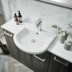 - Elevate your Etienne Curved Vanity Units with our luxurious solid surface worktops and coordinating splash backs.
