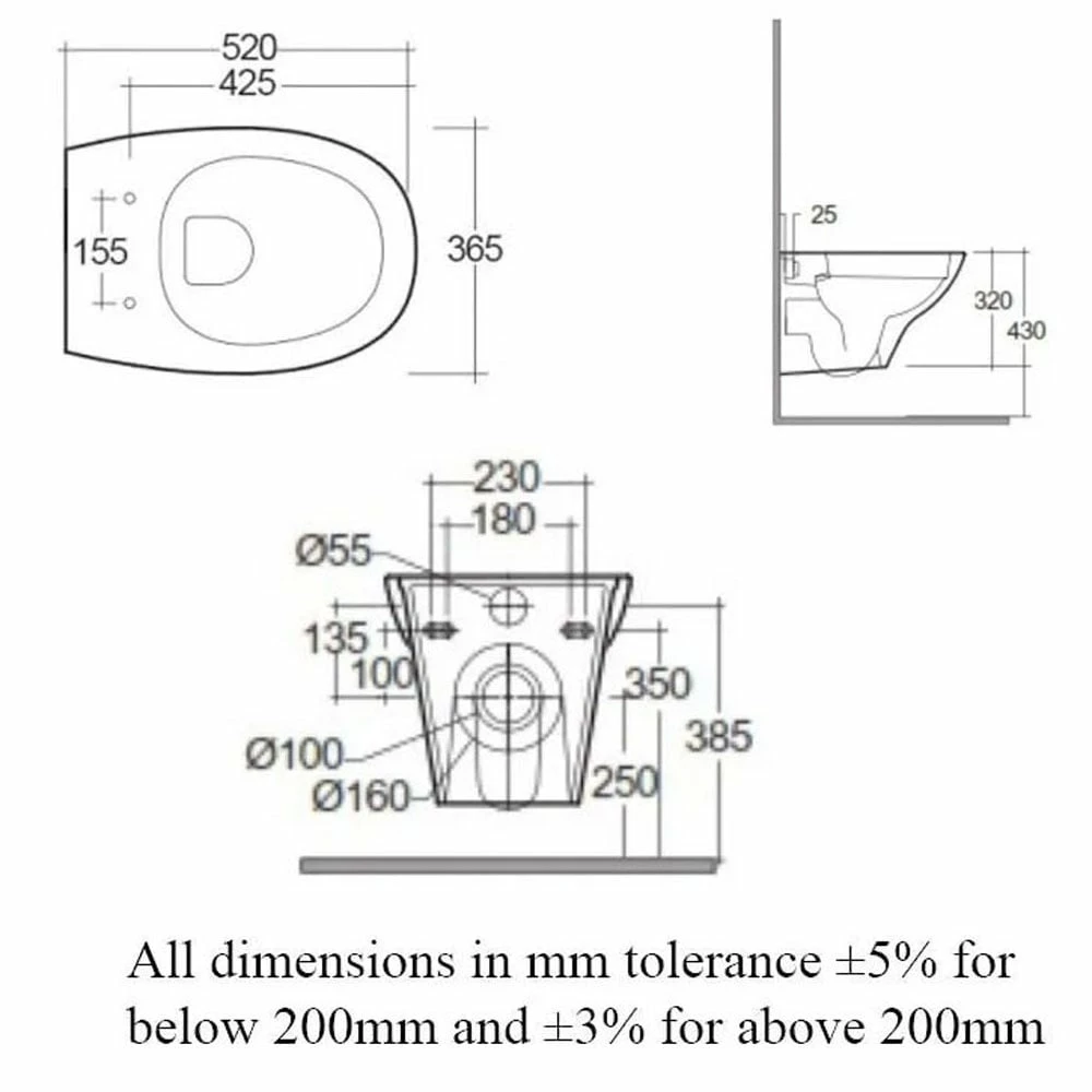 - Toilet Seat Hole Centres: 155mm