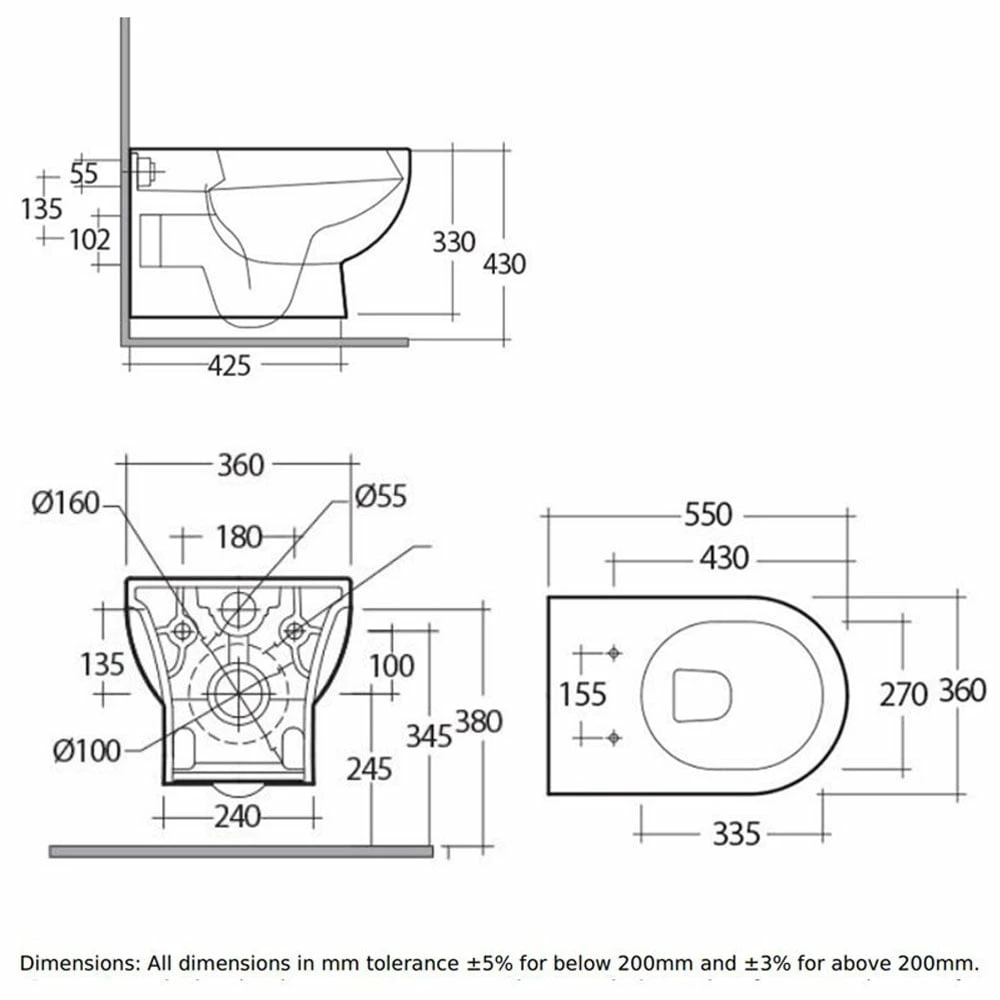 - Toilet Seat Hole Centres: 155mm